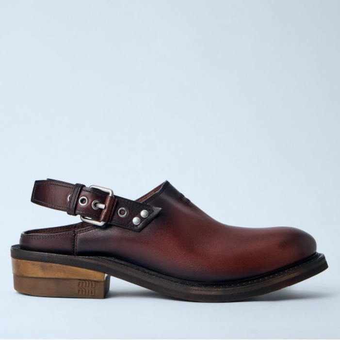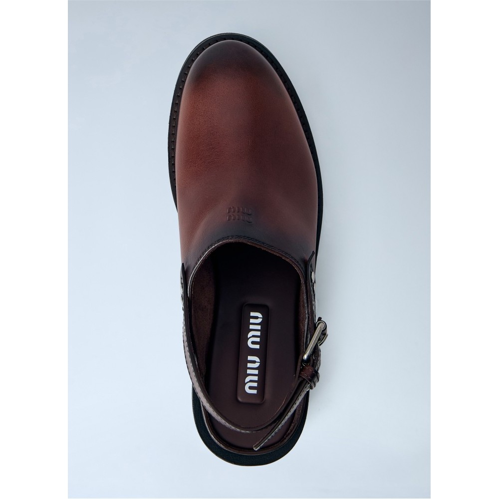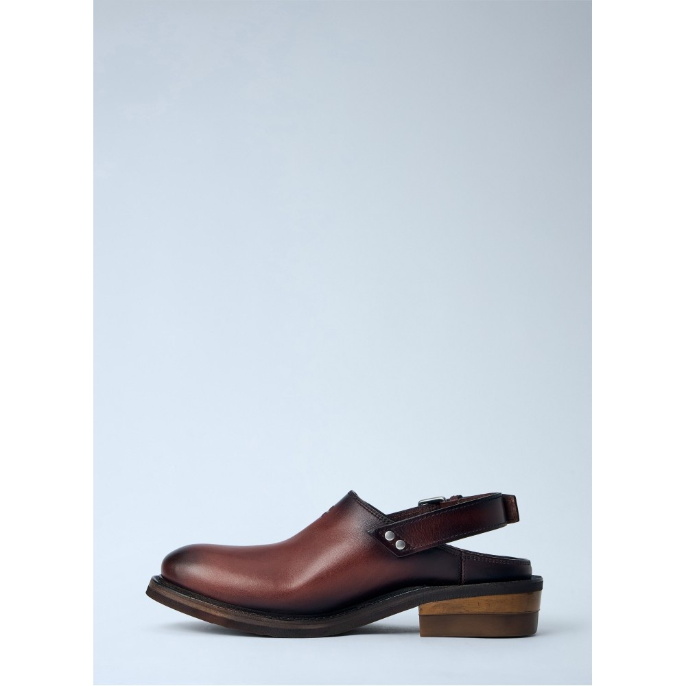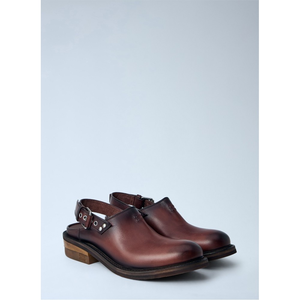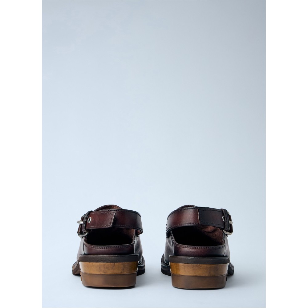 Slingback clogs with adjustable buckle strap.