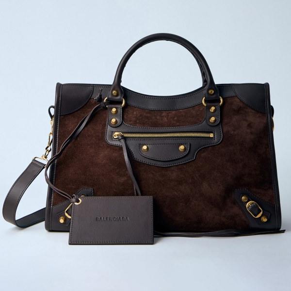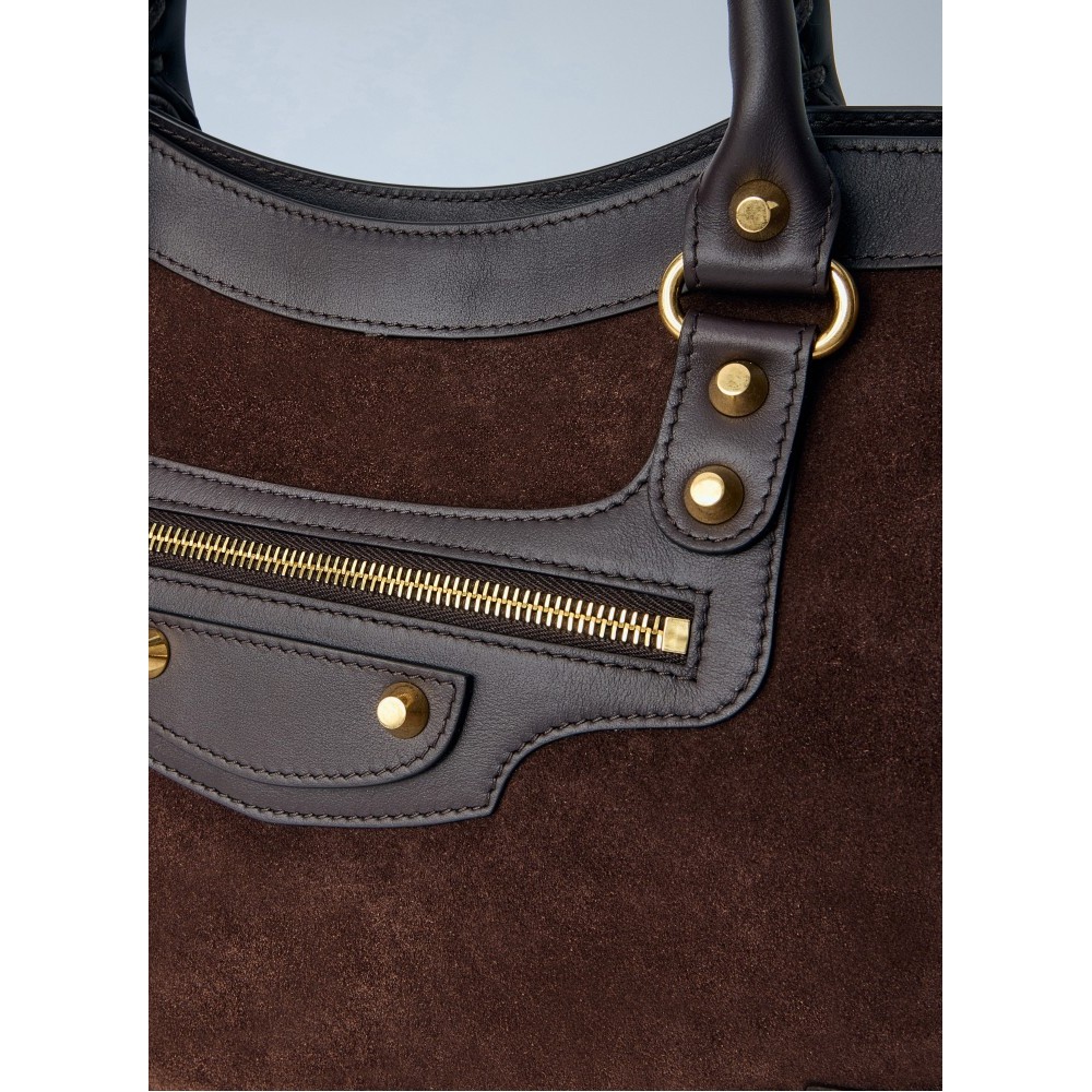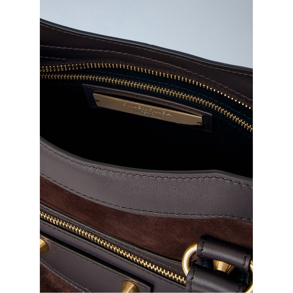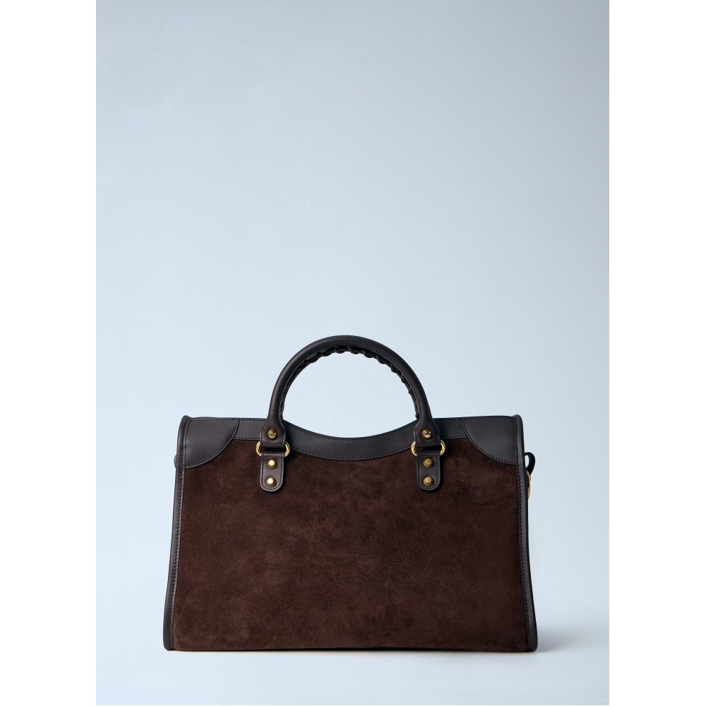 Handbag in leather and suede with brass-tone hardware.