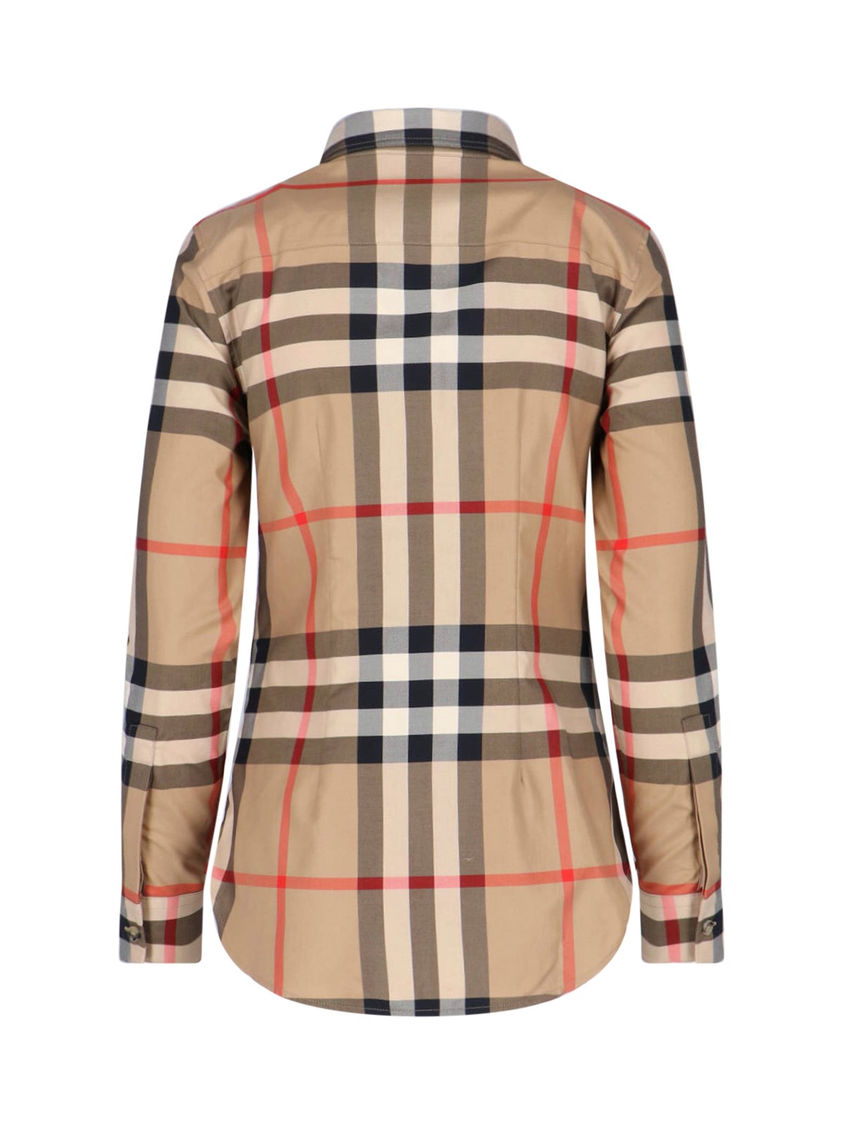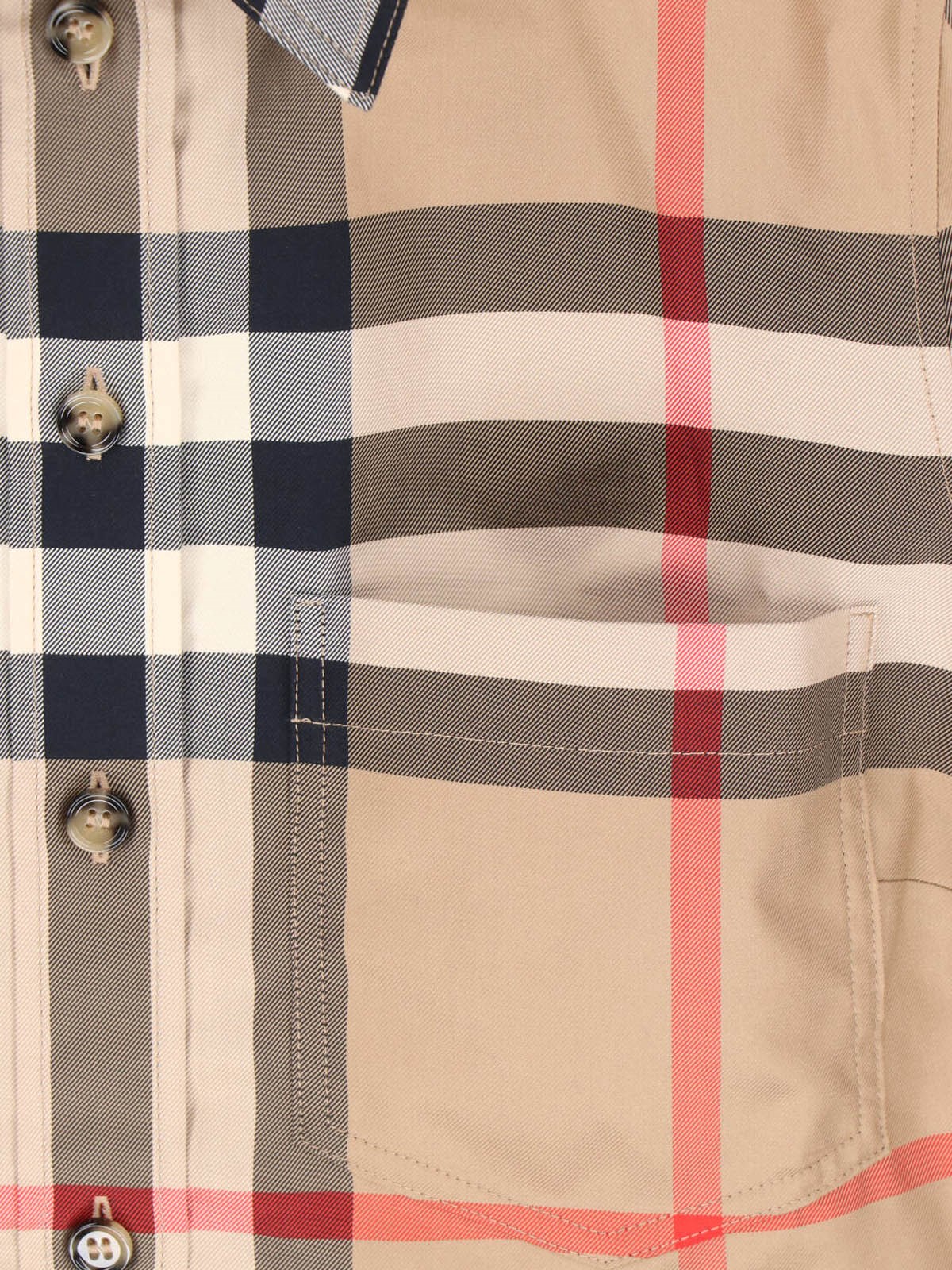 Burberry beige cotton 'Check' shirt with all-over Check logo pattern, collar, button closure, long sleeves, button cuffs, curved hem.