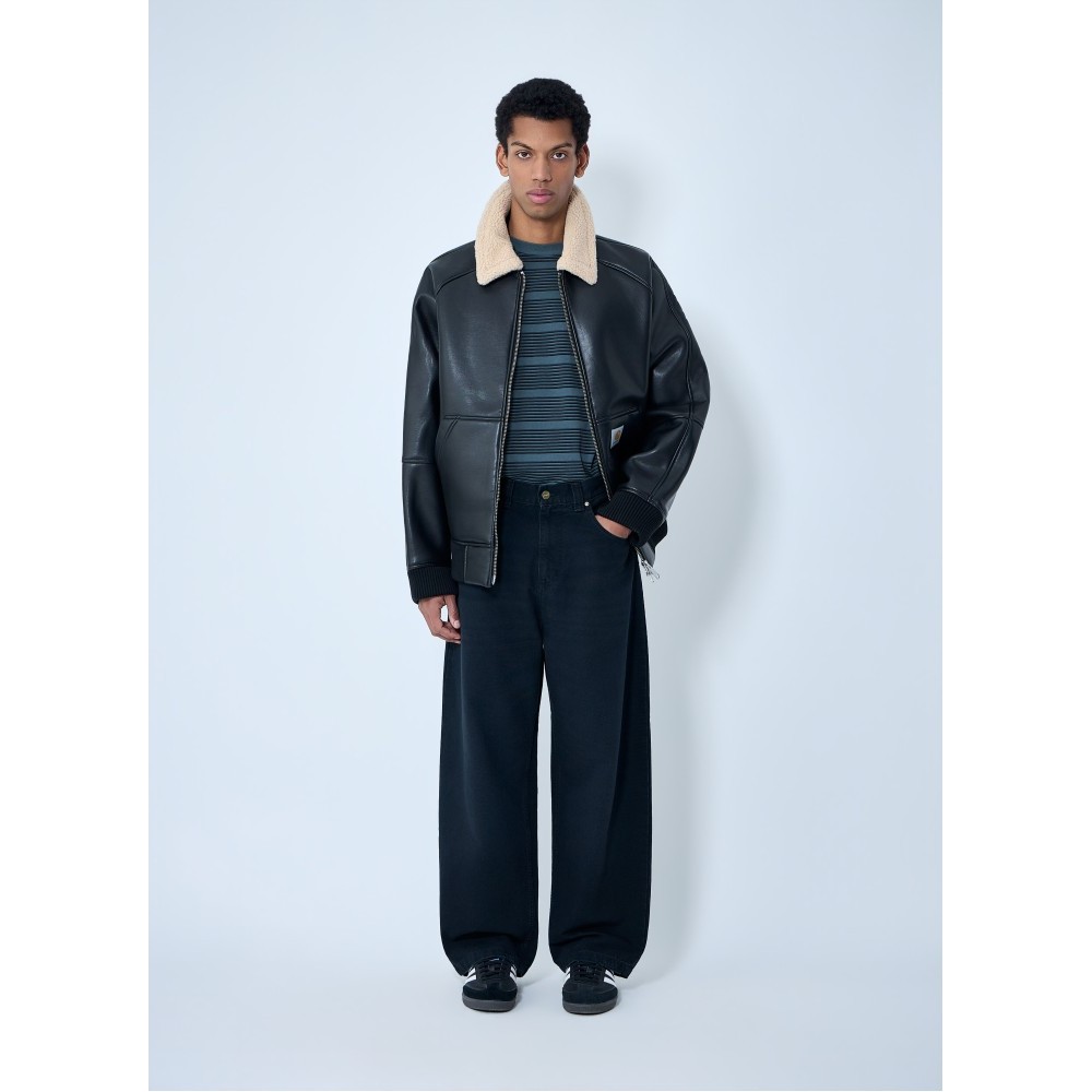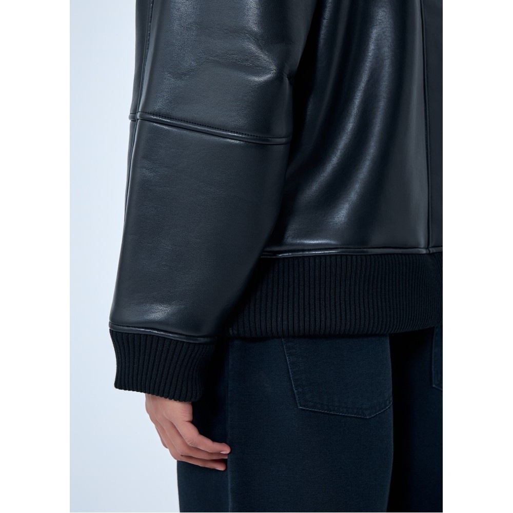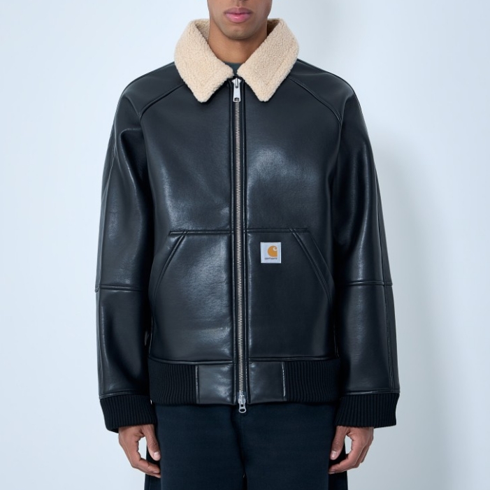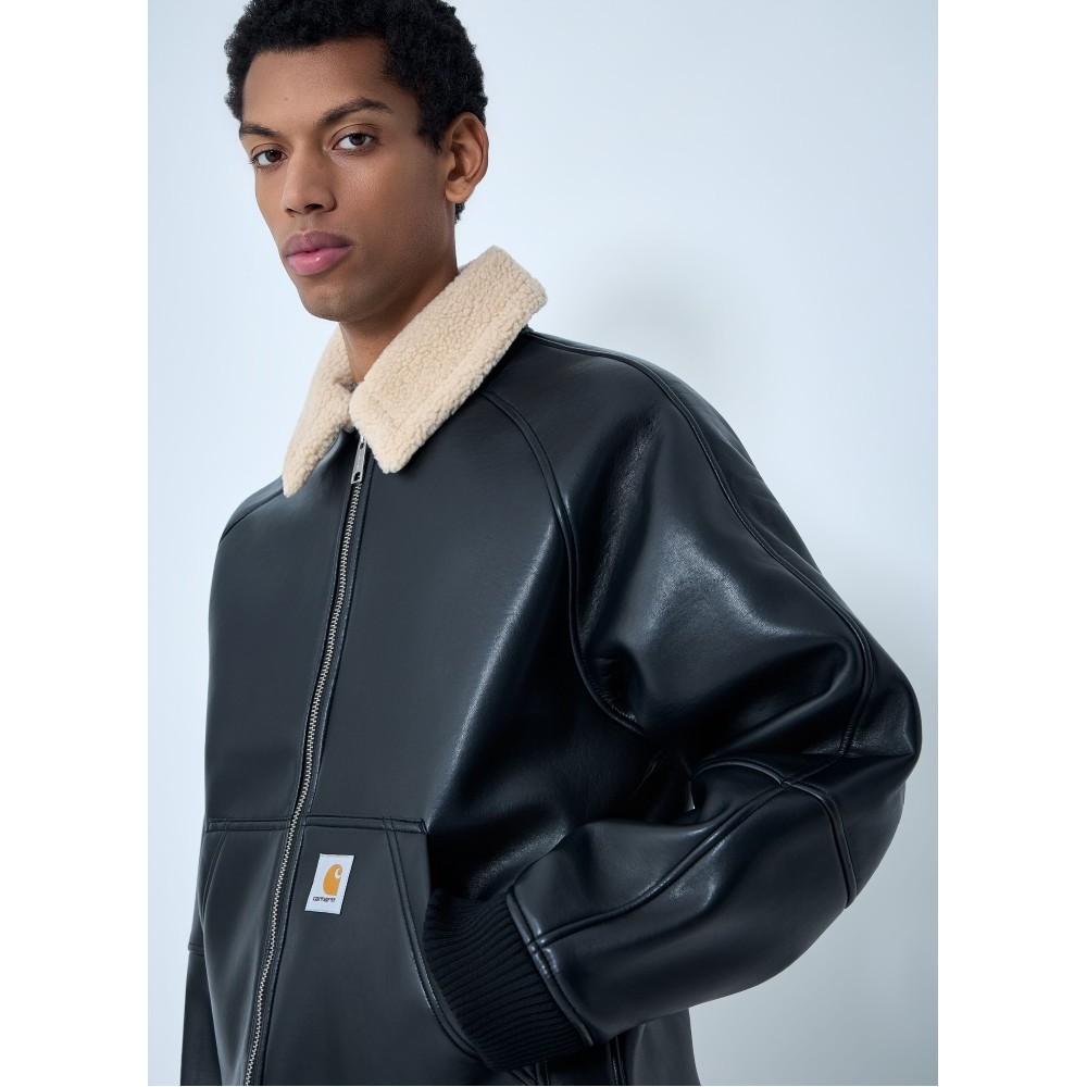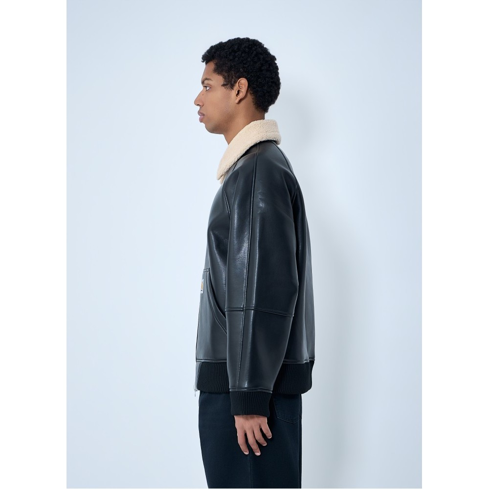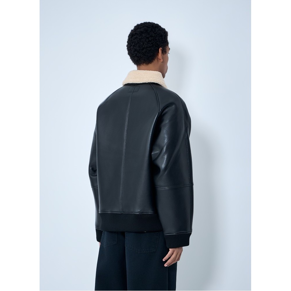 Shearling-collar leather jacket with ribbed trims.